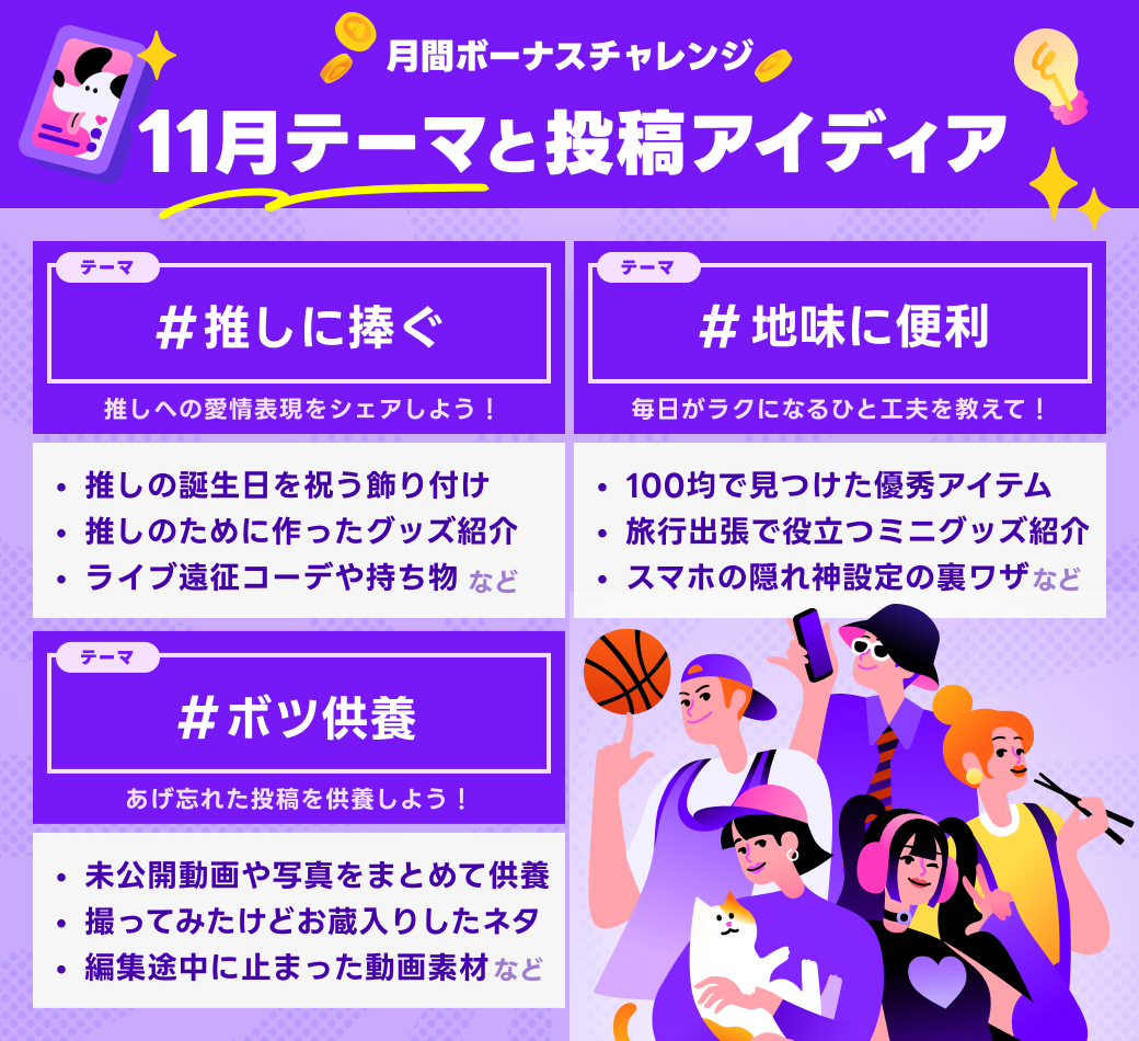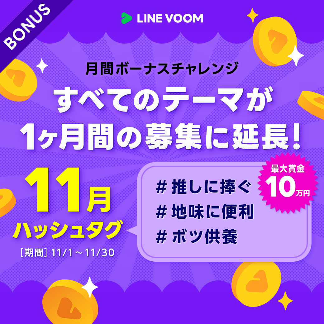LINE VOOMでは、毎月賞金をご用意した「月間ボーナスチャレンジ」を開催いたします。